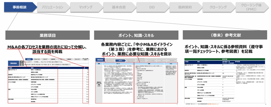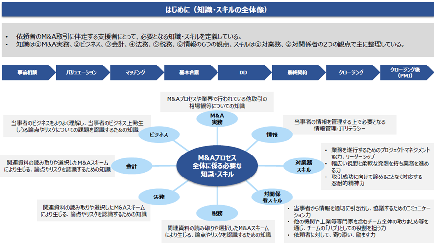また、スキルマップは事前相談からクロージング後までのM&Aプロセスごとに求められる具体的な知識・スキルを詳細にわたって体系的に整理しています。