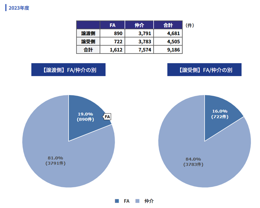 上記の理由から、片側FAを活用して利益相反を避けるという選択を取る事業オーナーも少なくありません。M&A支援機関の登録制度による集計結果には、市場の実態(FAと仲介の利用割合やそれぞれの報酬率の分布等)が示されています。