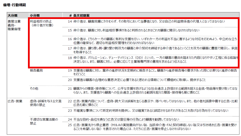 - 特にM&A仲介者については、売り手・買い手双方を支援する構造上、利益相反が生じるおそれがあるため、「利益相反の防止」を明示している。