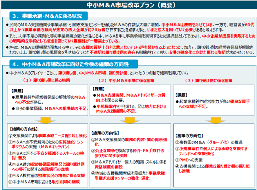 中小M&A市場改革プランは、事業承継・M&Aに係る状況について、「M&A支援機関が増加する中で、その支援の質が十分とは言えないという声も聞かれるようになった」と明記しています。こうした実態を踏まえ、中小企業庁は市場の健全化に向けた施策を進める方針です。